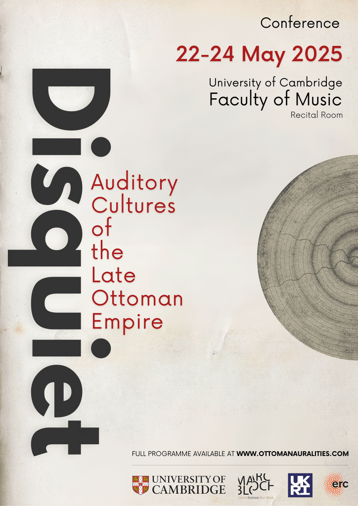 These broad lines of inquiry underpin the ERC/UKRI-funded project, “Ottoman Auralities and the Eastern Mediterranean: Sound, Media, and Power in the Long Nineteenth Century.” In conjunction with that project, we are pleased to announce an upcoming conference, “Disquiet: Auditory Cultures of the Late Ottoman Empire,” to be held 22-24 May 2025 at the University of Cambridge. In this conference, we aim to explore the manifold auditory histories of the late Ottoman Empire and surrounding eastern Mediterranean. In doing so, we hope to further elucidate possibilities for sound studies and global music history to engage more substantively with the Ottoman Empire as part of a broader “remapping” impulse (see Steingo and Sykes 2019), and for Ottoman history to deepen its understandings of the sensory and phenomenological experiences of the long nineteenth century, including those official social reforms as well as other shifts in science, medicine, and technology.