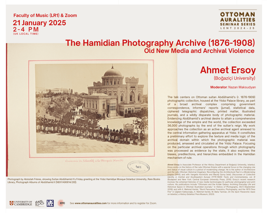 The talk centers on Ottoman sultan Abdülhamid’s (r. 1876-1909) photographic collection, housed at the Yıldız Palace library, as part of a broad archival complex comprising government correspondence, informers’ reports (jurnal), statistical data, ciphered telegraphic dispatches, printed matter, illustrated journals, and a wildly disparate body of photographic material. Evidencing Abdülhamid’s archival desire to attain a comprehensive knowledge of the empire and the world, the collection exceeded 36,000 photographs by the end of the sultan’s reign. My work approaches the collection as an active archival agent annexed to the central information gathering apparatus at Yıldız. It constitutes a preliminary effort to explore the texture and media logic of the archival domain within which the photographic material was produced, amassed and circulated at the Yıldız Palace. Focusing on the particular archival operations through which photography was processed as evidence by the state, it also explores the biases, predilections, and hierarchies embedded in the Hamidian mechanism of rule.
